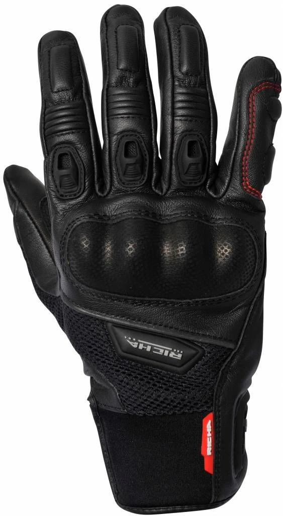 Geitenleer en mesh zijn de hoofdbestandsdelen van deze handschoen. De knokkels zijn voorzien van een harde PVC protector en ook de palm en vingers van de handschoen zijn voorzien van extra bescherming in de vorm van Temper foam. Ook is er door Richa gedacht aan zichtbaarheid bij slecht zicht door enkele reflecterende details te verwerken.
