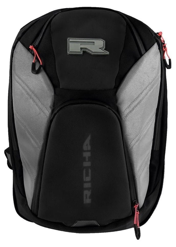 De Richa Flash heeft een groot opbergvak, voorzien van een laptopvak. Daarnaast beschikt hij over een opbergvak aan de voor- en bovenzijde. Je kunt zelfs spullen kwijt in de bevestigingsriem op de taille. De onderzijde van de rugzak is extra verstevigd. Op de rugzak zitten diverse reflecterende 3M delen zodat je extra opvalt in het verkeer. De Richa Flash rugzak wordt standaard geleverd met een regenhoes zodat je hem ook zorgeloos in de regen gebruikt.