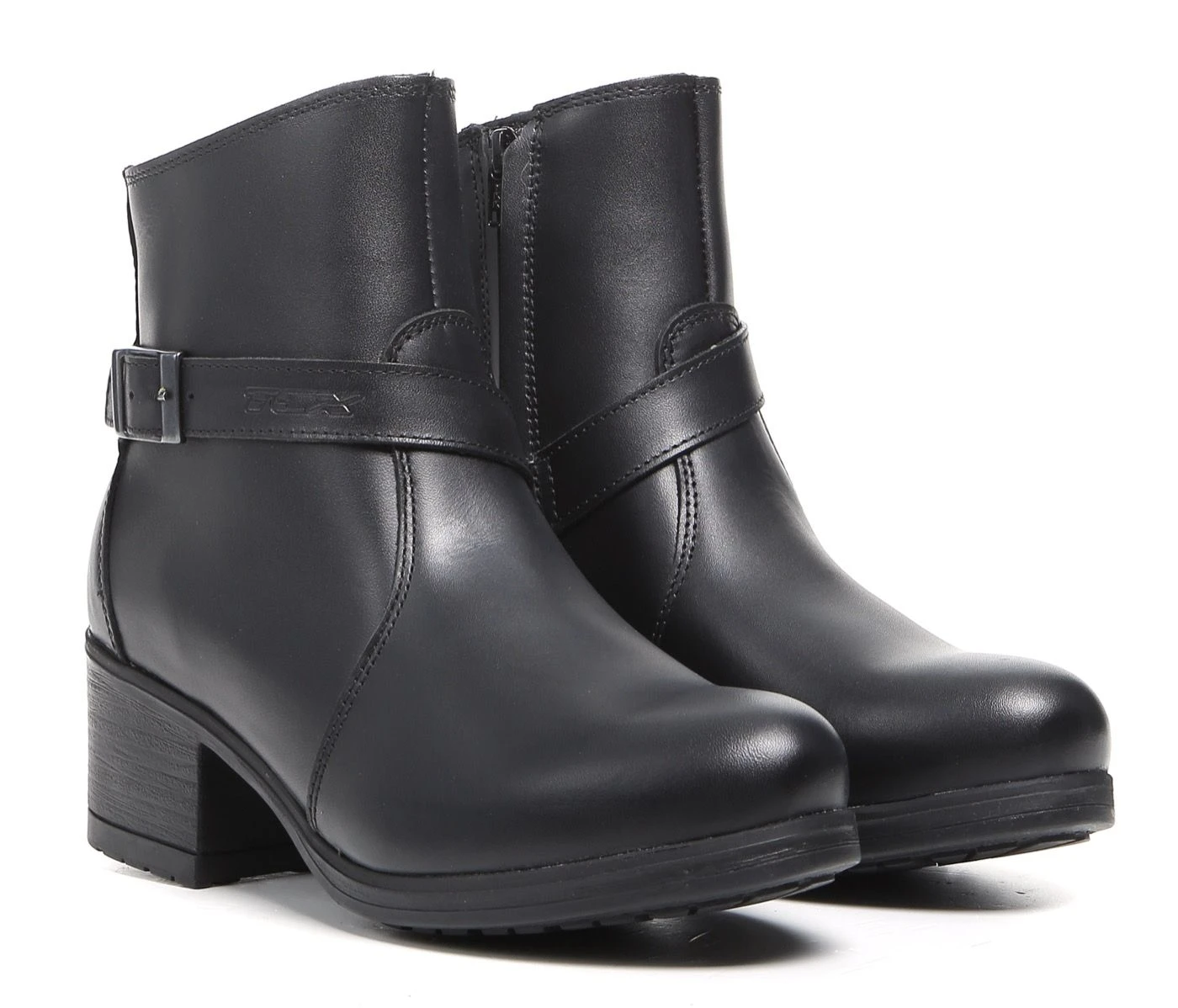 De TCX X-Boulevard WP motorschoen is een halfhoog model dames laars die jou uiterst stijlvol en toch geheel veilig op de motor laat stappen. Door de 4,5 cm hoge hak geeft die de kortere dames een zekerder gevoel om beide voeten aan de grond te krijgen. De leren buitenlaag verhuld een waterdicht membraan waardoor die nattigheid voorkomt. Ideaal te combineren met je black on black leren outfit of met een stoere motorjeans of -legging.